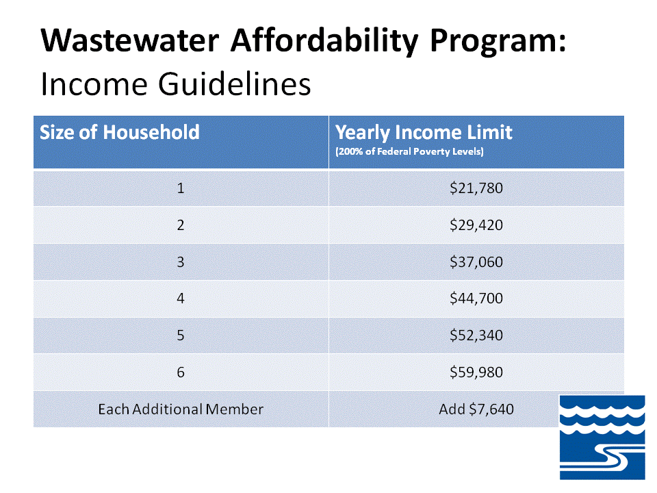 We are adding a Wastewater Affordability Program to our cost-saving programs offerings to benefit those with income level at/below 200% Federal poverty level (e.g. Family of four < $44,700). Learn about all of our cost-saving programs | View all Affordability Program income limits