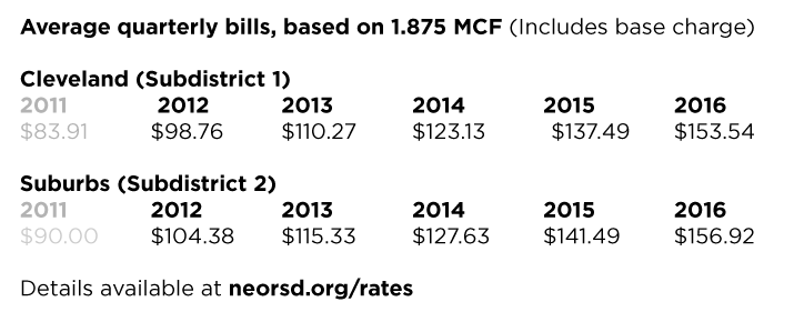 Sewer District bills are based on water consumption of 1 MCF (1,000 cubic feet = 7,480 gallons). Currently, an average Sewer District household uses 1.875 MCFs per quarter; Cleveland residents pay, on average, $83.91 per quarter and suburban residents pay, on average, $90 per quarter. Beginning 2012 through 2016, customers will pay approximately $14 more per quarter. For example, in 2012, Cleveland customers will pay about $99 per quarter and in 2012, suburban customers will pay about $104 per quarter.